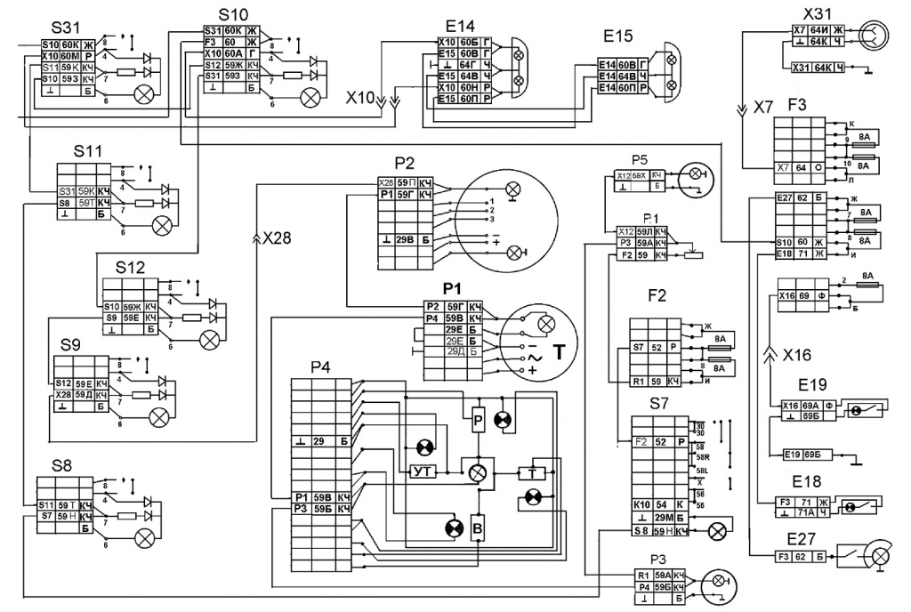 На схеме цветной электропроводки КамАЗ-5320 расположены: